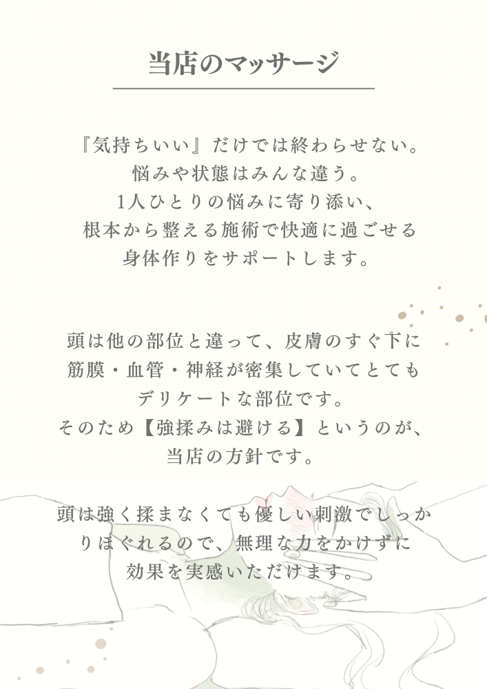 頭をほぐす事で自律神経の乱れが良くなり心の不調が整い、血流が良くなる事で圧迫感から解放されスッキリしたお身体に導きます。